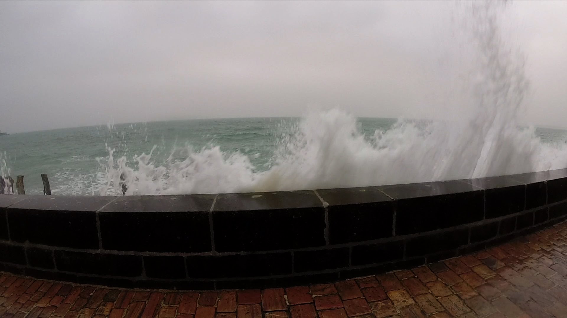 Les vagues fracassent le mur avec de plus en plus de force, poussées par des vents devenus violents.